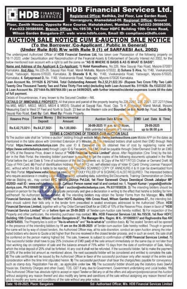 DETAILS OF IMMOVABLE PROPERTY: All that piece and parcel of the property bearing No.225,225/1, 226, 226/1, 227,227/1 (New No. M60, M60/1, M60/2 M60/3, M60/4 & M60/5) Situated at Sayyaji Rao, Road, Opp. To K. R Hospital, Mandi Mohall, Mysore Measuring East to West 37 Feet and North to South: 23 feet on the Western side and Bounded on the: North by: Road, South By: Sayyai Rao Road, East By: Galli, West By: Private Property.