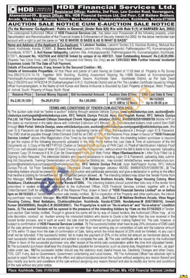 Details of Immovable Properties: All that Piece and parcel of Land Having an Extent of 11.52 Ares of Property in Ry Survey Nos 285/210,214 1A, 18. Together With Building, Building Assesment Bearing No. 1/668 Situated at Kunnamangalam Panchayath Kunnamangalam Village. Kunnamangalam Desom, Kozhikode Taluk Kozhikode District, as Per Sale Deed Nos 2158/2016 and 1474/2014 Of Chathamangalam SRO, Kozhikode District and as Per The Location Certificate Issued by Village officer Kunnamangalam, in the Name of Anil Kumar and Beena Anilkumar is Bounded by East: Property of Mosque West Property of Ashraf, South: Property of Koya, North: Road