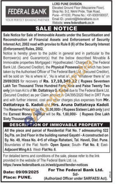 All the piece and parcel of Residential Flat No. 7 admeasuring 522 Sq.Fts. on 2nd Floor in the building named Gayatri -A constructed on Sy. No. 49, Hissa No. 4+5 of village Rahatani, Tal. Haveli, Dist. Pune. Boundaries of the Flat: North- Open Space: South Flat No. 8; East-Adjacent Wing A & West-Flat No. 6.