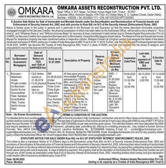 All that piece and parcel of Iminoveable Property admeasuring 1162.50 Sq. Mirs and Guest House Admeasuring 2712.50 Sq Mirs total 3875 Sq. Mtrs. together with all constructions therein, in Revenue Survey No. 158212, City Survey No 56, TP. Scheme No. 4. Final Plot No. 72 in the area of Village Anand, Taluka & District Anand