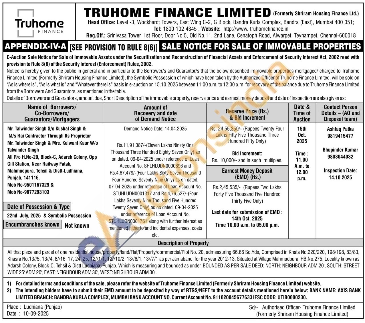 All that piece and parcel of one residential house/property/land/Flat/Property/commercial/Plot No. 20, admeasuring 66.66 Sq. Yds, Comprised in Khata No. 220/220, 198/198, 83/83, Khasra No.13//5, 13//4, 8//16, 17, 24, 25, 12//1/1, 12//10/2, 13//6/1, 13//7/1 as per Jamabandi for the year 2012-13, Situated at Village Mahmudpura, HB.No.275, Locality known as Adarsh Colony, Block-C, Tehsil & Distt Ludhiana, Punjab. Which is measuring and bounded as under. BOUNDED AS PER SALE DEED: NORTH: NEIGHBOUR ADM 20', SOUTH: STREET WIDE 25' ADM 20', EAST: NEIGHBOUR ADM 30', WEST: NEIGHBOUR ADM 30'
