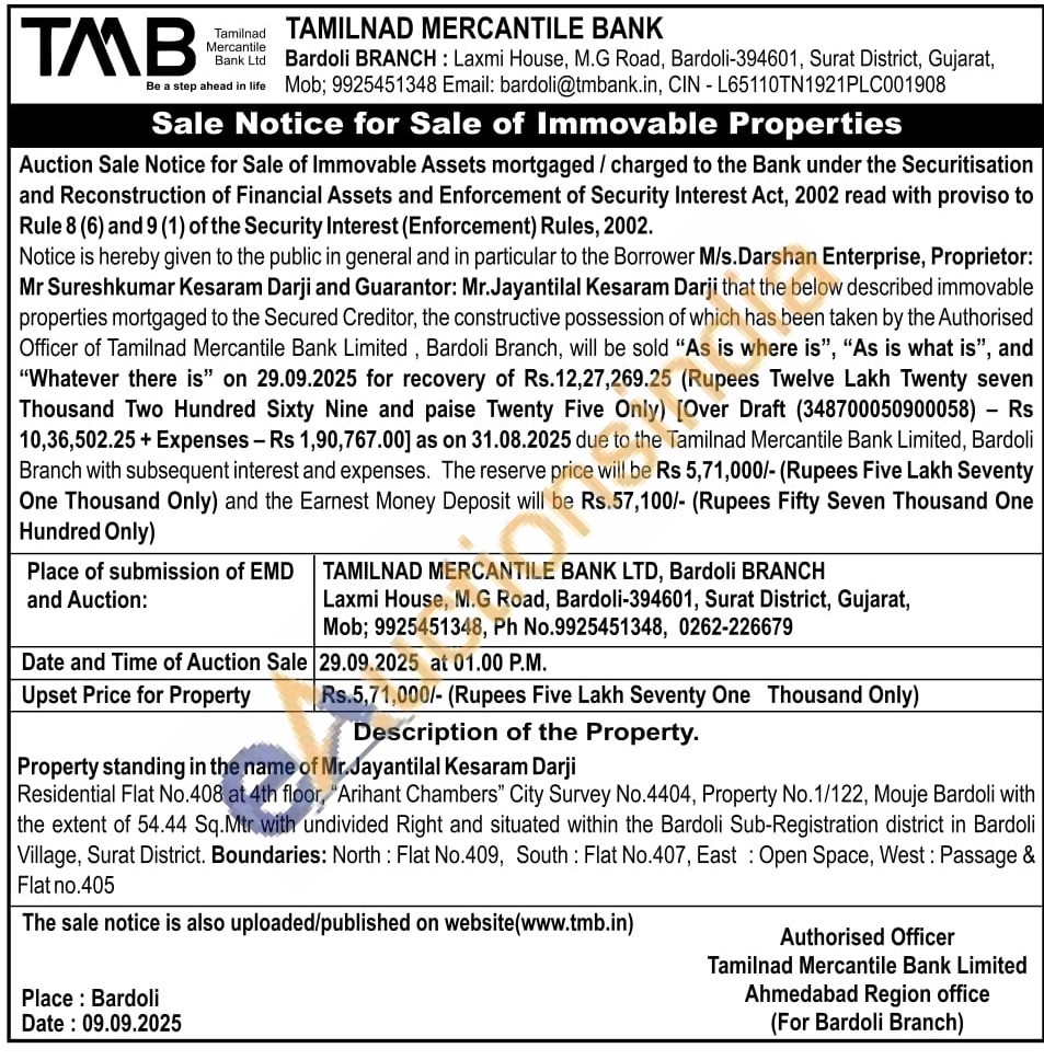 Residential Flat No.408 at 4th floor, "Arihant Chambers" City Survey No.4404, Property No. 1/122, Mouje Bardoli with the extent of 54.44 Sq.Mtr with undivided Right and situated within the Bardoli Sub-Registration district in Bardoli Village, Surat District. Boundaries: North: Flat No.409, South: Flat No.407, East: Open Space, West: Passage & Flat no.405