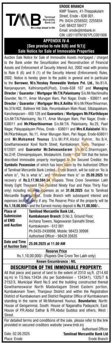 All that piece and parcel of land to the extent of 2310 sq.ft. (214.60 sq.m) in T.S.Nos. 1343A (As per Subdivision 1343A1), 1325/7 & 2152/3, Municipal Ward No.5 and the building constructed thereat Gowthameswarar North Madavilagam Street Eastern portion, Kumbakonam Town, Thanjavur District and within the Registration District of Kumbakonam and District Registrar Office of Kumbakonam standing in the name of Mr.Mohamed Younus. Boundaries: North: House of Gengammal, South: House of Naganatha Padayachi, East: House of P.R.Abdul Sathar & PR.Abdul Guddus and others, West: Street
