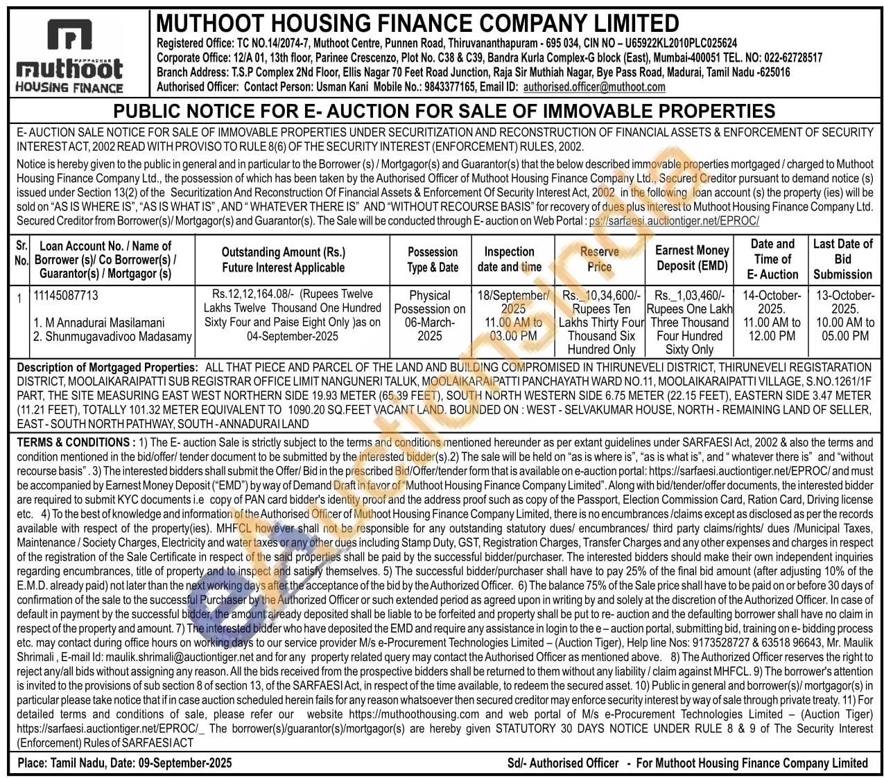 Authorised Officer: Contact Person: Usman Kani Mobile No: 9843377165