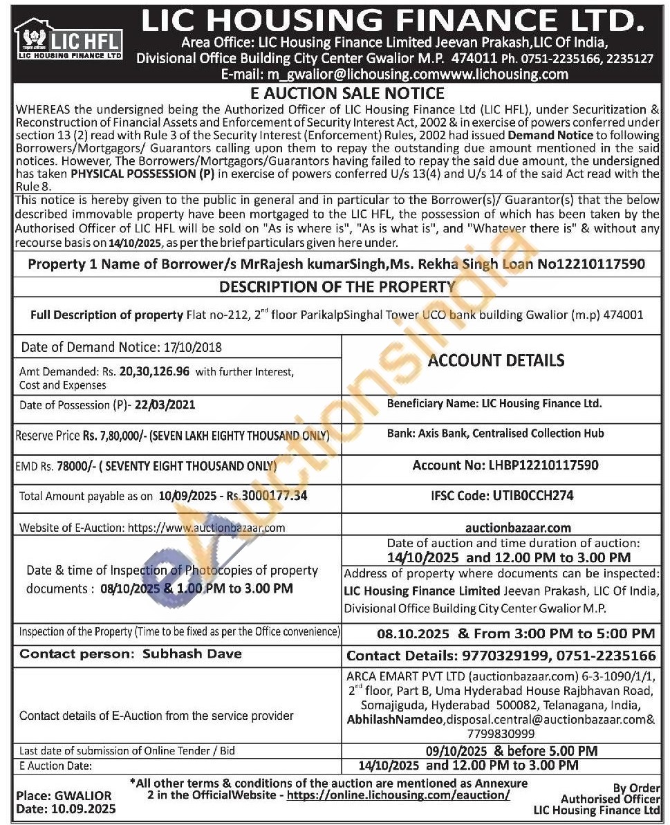 Full Description of property Flat no-212, 2nd floor ParikalpSinghal Tower UCO bank building Gwalior (m.p) 474001