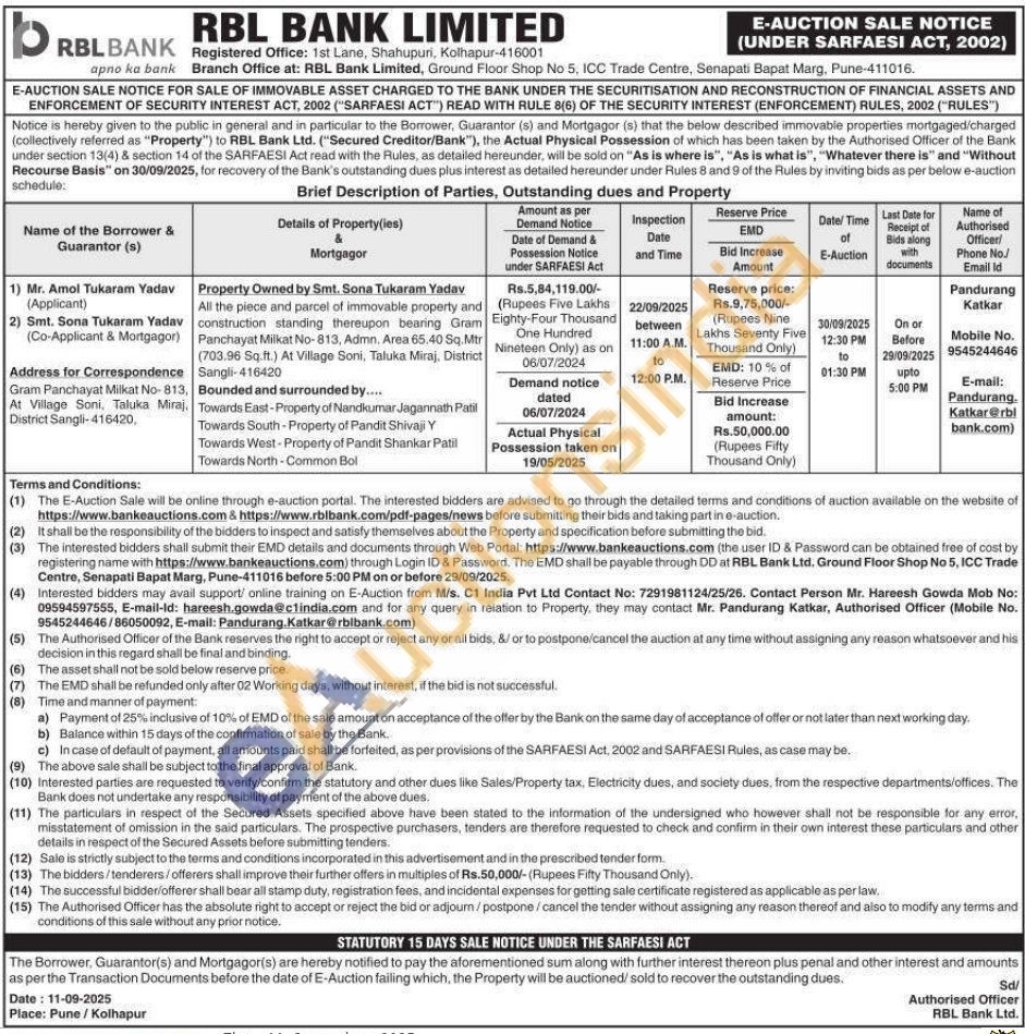 Property Owned by Smt. Sona Tukaram Yadav All the piece and parcel of immovable property and construction standing thereupon bearing Gram Panchayat Milkat No-813, Admn. Area 65.40 Sq. Mtr (703.96 Sq.ft.) At Village Soni, Taluka Miraj, District Sangli-416420 Bounded and surrounded by.... Towards East-Property of Nandkumar Jagannath Patil Towards South-Property of Pandit Shivaji Y Towards West-Property of Pandit Shankar Patil Towards North Common Bol