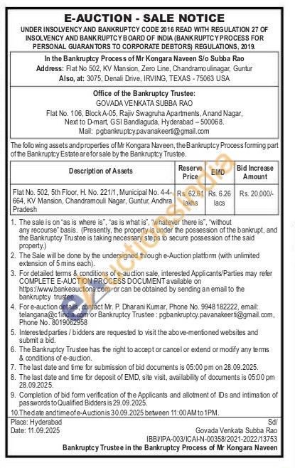 Flat No. 502, 5th Floor, H. No. 221/1, Municipal No. 4-4-664, KV Mansion, Chandramouli Nagar, Guntur, Andhra Pradesh