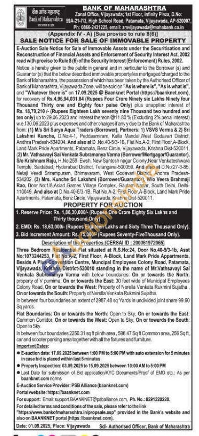 Three Bedroom Residential Flat situated at R.S.No:24, Door No.40-5/3-1b, Asst No:1073244253, Flat No:A-2, First Floor, A-Block, Land Mark Pride Appartments, Beside A Plus Convention Centre, Muncipal Employees Colony Road, Patamata, Vijayawada, Krishna District-520010 standing in the name of Mr.Vathsavayi Sai Venkata Subramanya Varma with below boundaries: On or towards the North: property of V purnima, On or towards the East: 30 feet wide of Municipal Employees Colony Road, On or towards the West: Property of Nerella Venkata Rukmini Sujatha, On or towards the South: Property of Nerella Venkata Rukmini Sujatha