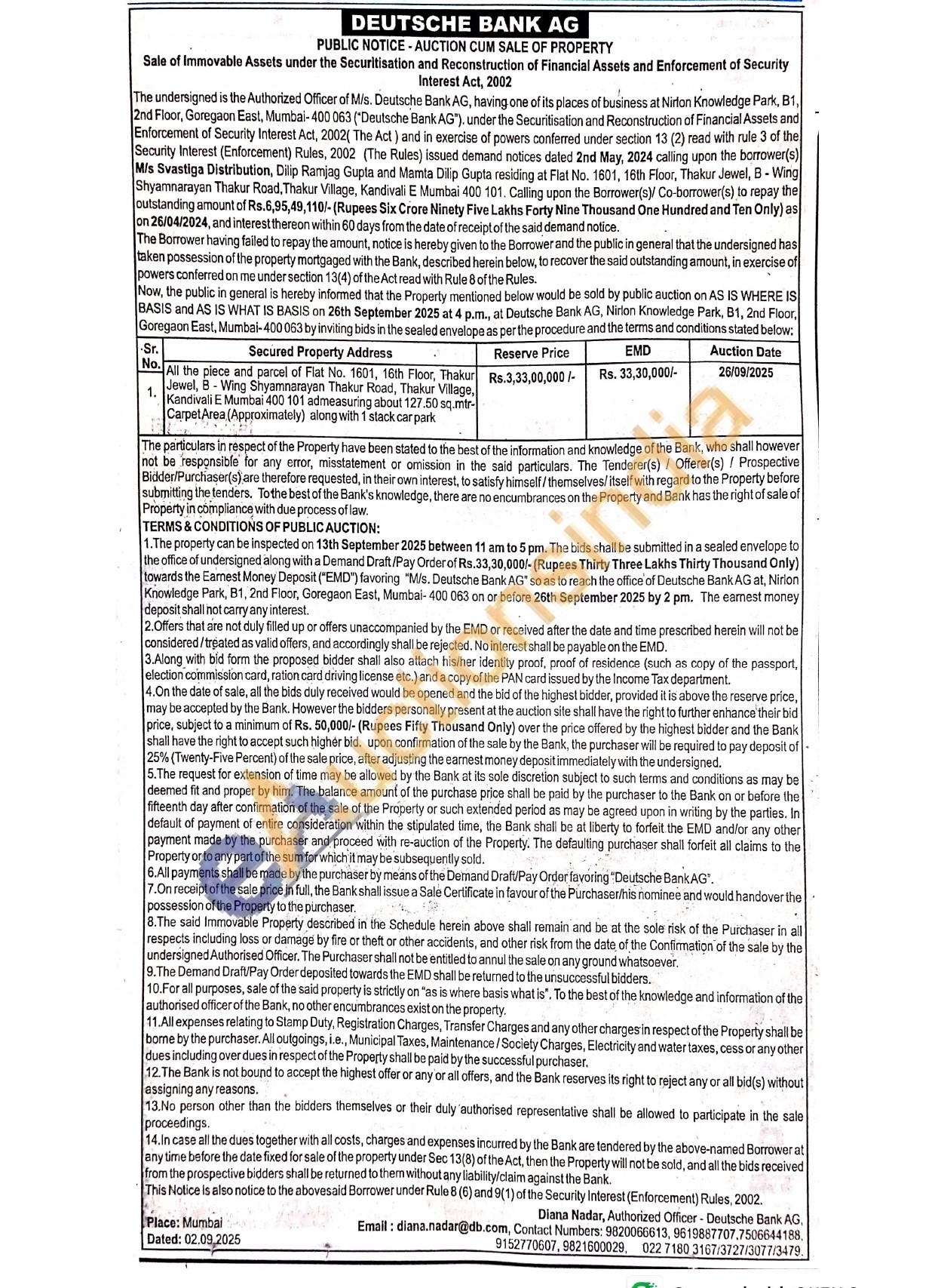 All the piece and parcel of Fiat No. 1601, 16th Floor, Thakur . Jewel, B-Wing Shyamnarayan Thakur Road, Thakur Village, Kandivali E Mumbai 400 101 admeasuring about 127.50 sq.mtr-Carpet Area (Approximately) along with stack car park