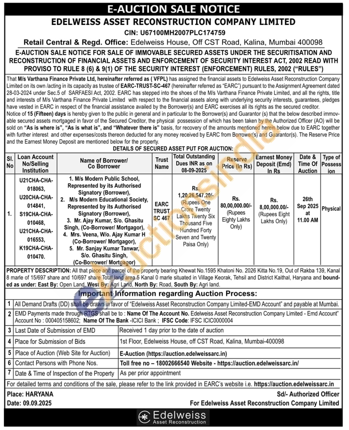 All that piece and parcel of the property bearing Khewat No. 1595 Khatoni No. 2026 Kitta No. 19, Out of Rakba 139, Kanal 8 marle of 15/697 share and 10/697 share Total land area 5 Kanal 0 marle situated in Village Keorak, Tehsil and District Kaithal, Haryana and bound-ed as under: East By: Open Land, West By: Agri Land, North By: Road, South By: Agri land.