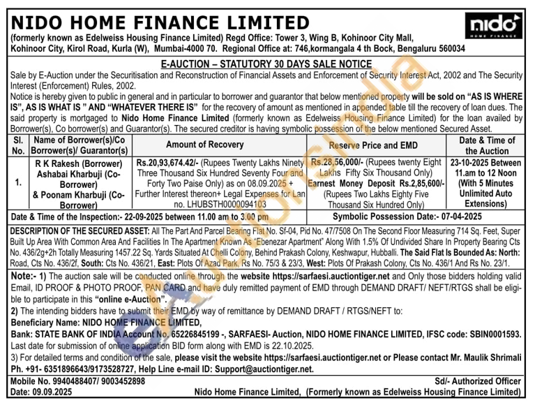 All The Part And Parcel Bearing Flat No. Sf-04, Pid No. 47/7508 On The Second Floor Measuring 714 Sq. Feet, Super Built Up Area With Common Area And Facilities In The Apartment Known As "Ebenezar Apartment" Along With 1.5% Of Undivided Share In Property Bearing Cts No. 436/2g+2h Totally Measuring 1457.22 Sq. Yards Situated At Chelli Colony, Behind Prakash Colony, Keshwapur, Hubballi. The Said Flat Is Bounded As: North: Road, Cts No. 436/2f, South: Cts No. 436/21, East: Plots Of Azad Park, Rs No. 75/3 & 23/3, West: Plots Of Prakash Colony, Cts No. 436/1 And Rs No. 23/1