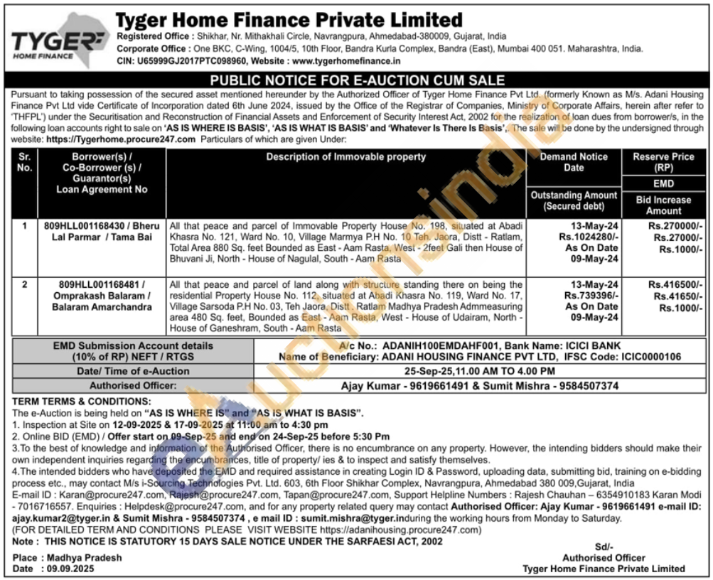 All that peace and parcel of land along with structure standing there on being the residential Property House No. 112, situated at Abadi Khasra No. 119, Ward No. 17, Village Sarsoda P.H No. 03, Teh Jaora, Distt. Ratlam Madhya Pradesh Admmeasuring area 480 Sq. feet, Bounded as East - Aam Rasta, West House of Udairam, North-House of Ganeshram, South - Aam Rasta