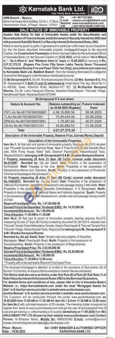 Item No.2: All that part & parcel of immovable property bearing resurvey No.47/2 measuring 32 ares 37 Sqm (80 Cents) covered by document No.261/2014, situated near Thirunelli Temple Road Mahavishnu Temple, Desom Panchayath & Thiruneli Temple Post Thirunelli Village, Mananthavadi Taluk, Wayanad Dist belonging to Mr. Devaprasad KS & Mr. Shankar Narayana Sharma