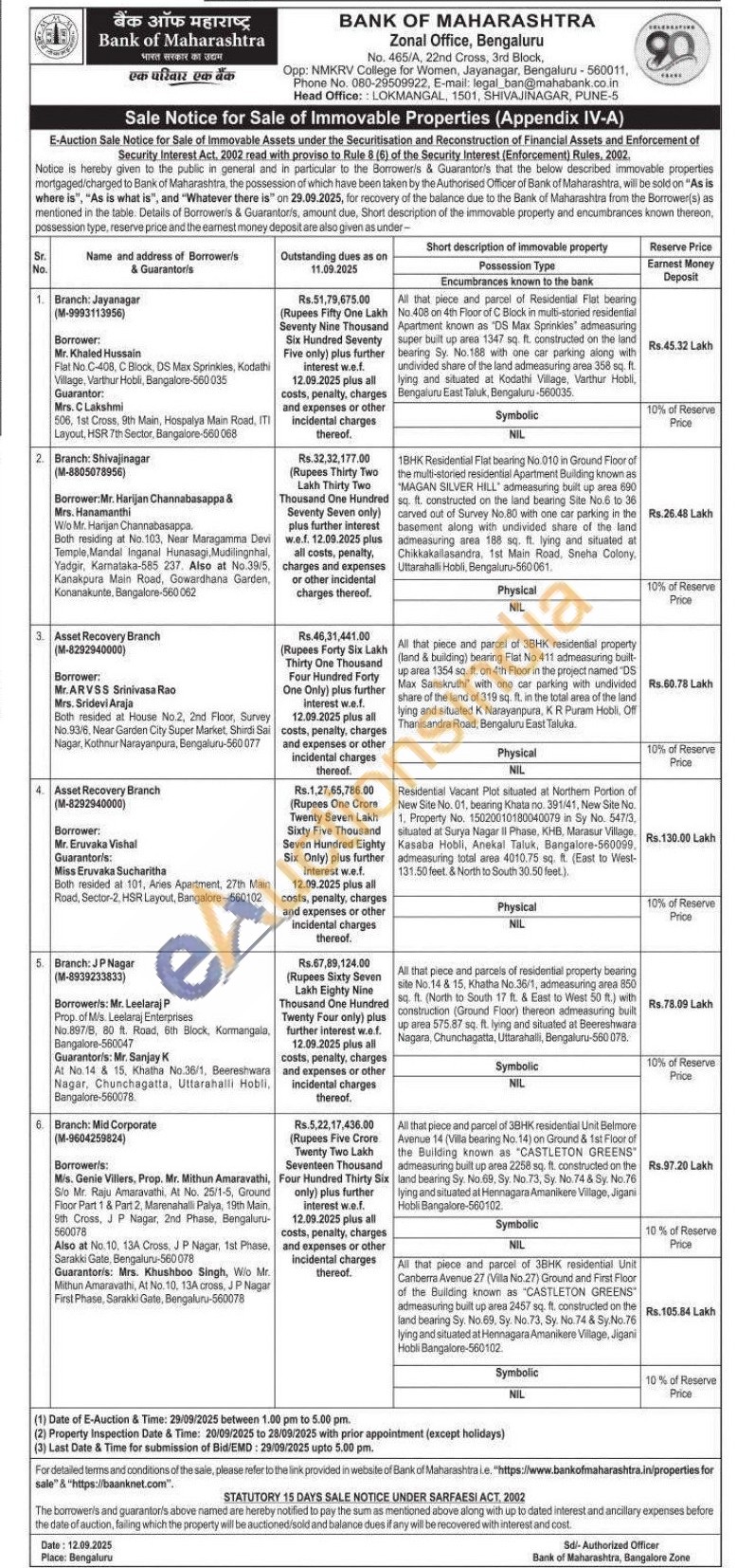 3) All that piece and parcel of 3BHK residential property (land & building) bearing Fiat No.411 admeasuring built-up area 1354 sq. ft. on 4th Floor in the project named "DS Max Sanskruthi with one car parking with undivided share of the land of 319 sq. ft. in the total area of the land lying and situated K Narayanpura, KR Puram Hobli. Off Thanisandra Road, Bengaluru East Taluka