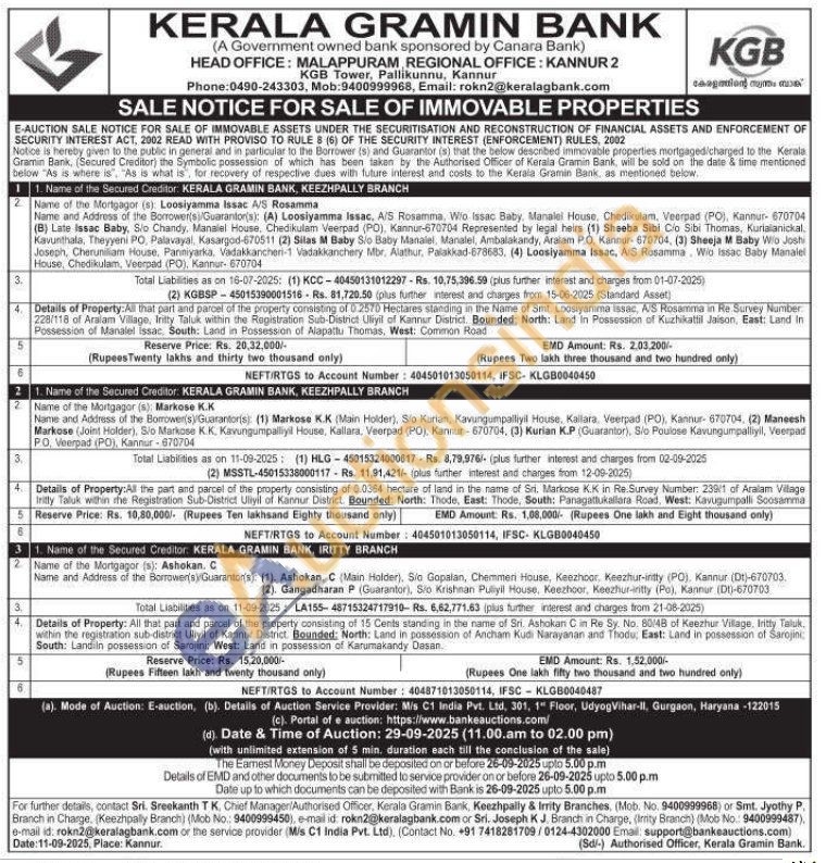 2) All the part and parcel of the property consisting of 0.0364 hectare of land in the name of Sri. Markose K.K in Re Survey Number: 238/1 of Aralam Village Iritty Taluk within the Registration Sub-District Uliyil of Kannur District. Bounded: North: Thode, East: Thode, South: Panagattukallara Road, West: Kavugumpalli Soosamma