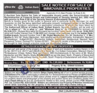 All that part and parcel of the property in 1.36 Ares of land and resciential building therein in Re Sy No. 207/17-2-2, 267/17 and 266-26-2-2 in Block No. 2 in Kollam Corporation, Neeravil Neeravil Cherry Thrikkadavoor Village, Kollam Takik and District SRO Anchalumoods in the name of Mr. Shybu Manikuttan and Mrs. Neethu Shybu BOUNDARIES as per title deed: North Property of Manoj and others, West Private pathway having 3 m width, South Property of Sudarshanam and others. East Drainage