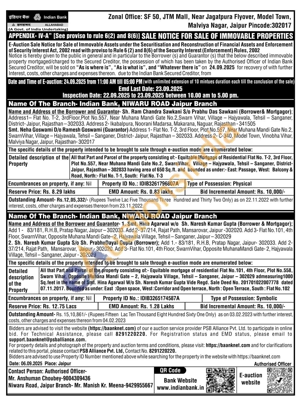 All that Part and Parcel of the property consisting of:- Equitable Mortgage of Residential Flat No. T-2, 3rd Floor, Plot No.557, Near Muhana Mandi Gate No.2, SwarnVihar, Village Hajyawala, Tehsil - Sanganer, District-Jaipur, Rajasthan -302033 having area of 650 Sq.ft. and bounded as under: - East: Passage, West: Balcony & Road, North:-Flat No. T-1, South: Flat No. T-3