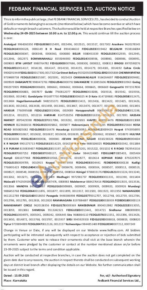 Fedbank Financial Services Ltd Gold Auctions Auction in Bengaluru
