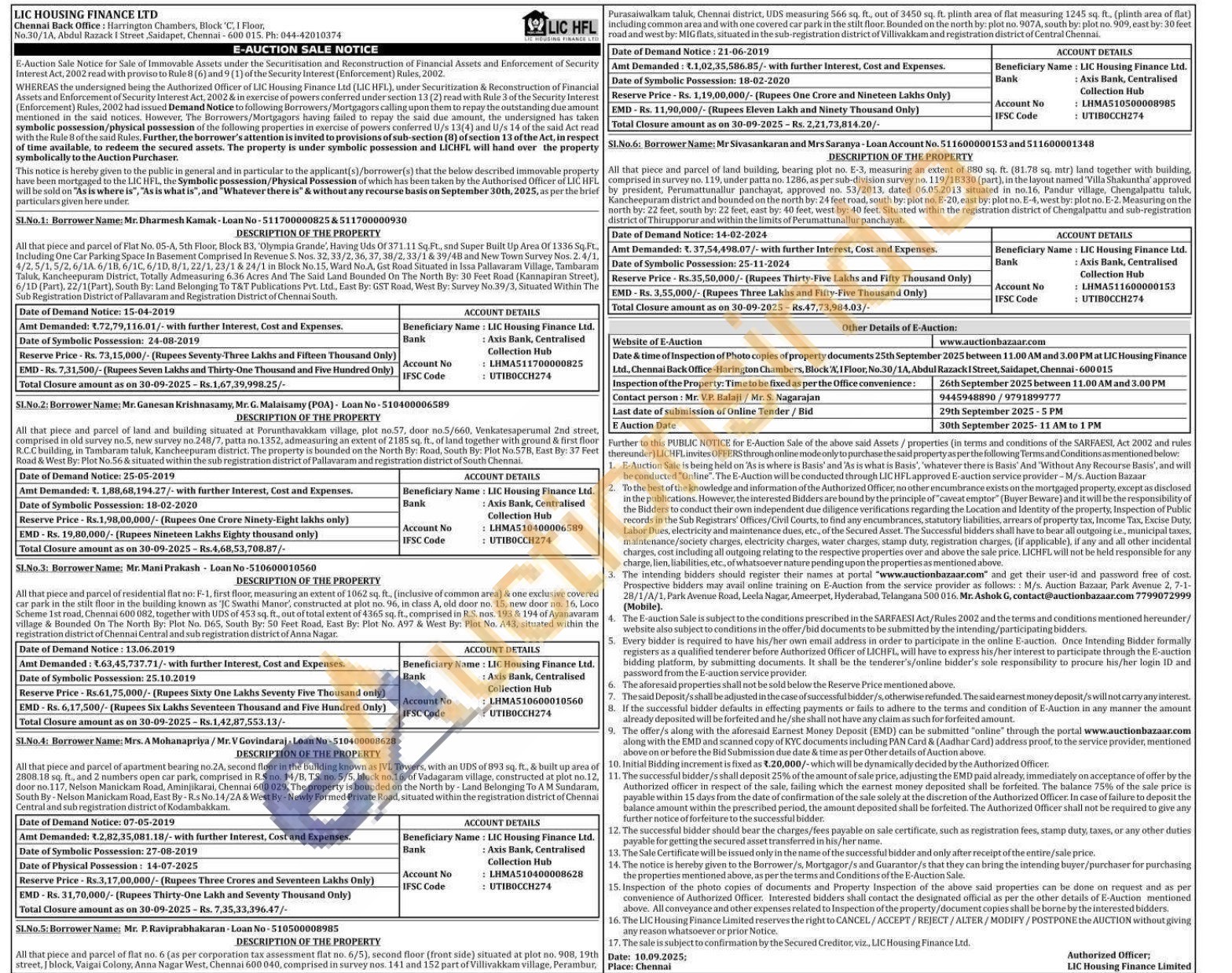6) All that piece and parcel of land building, bearing plot no. E-3, measuring an extent of 880 sq. ft. (81.78 sq. mtr) land together with building. comprised in survey no. 119, under patta no. 1286, as per sub-division survey no. 119/18330 (part), in the layout named 'Villa Shakuntha' approved by president, Perumattunallur panchayat, approved no. 53/2013, dated 06.05.2013 situated in no.16, Pandur village, Chengalpattu taluk, Kancheepuram district and bounded on the north by: 24 feet road, south by: plot no. E-20, east by: plot no. E-4, west by: plot no. E-2. Measuring on the north by: 22 feet, south by: 22 feet, east by: 40 feet, west by: 40 feet. Situated within the registration district of Chengalpattu and sub-registration district of Thirupporur and within the limits of Perumattunallur panchayat. Date of Demand Notice: 14-02-2024