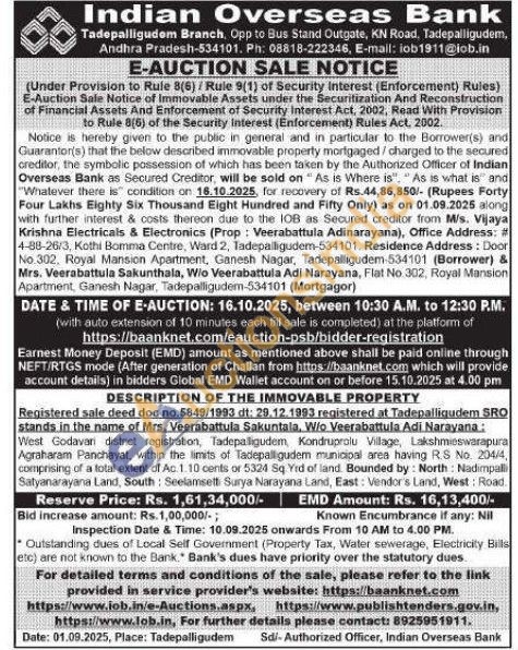 West Godavari district registration, Tadepalligudem, Kondruprolu Village, Lakshmieswarapura Agraharam Panchayat, within the limits of Tadepalligudem municipal area having R.S No. 204/4, comprising of a total extent of Ac. 1.10 cents or 5324 Sq. Yrd of land. Bounded by: North: Nadimpalli Satyanarayana Land, South: Seelamsetti Surya Narayana Land, East: Vendor's Land, West: Road.