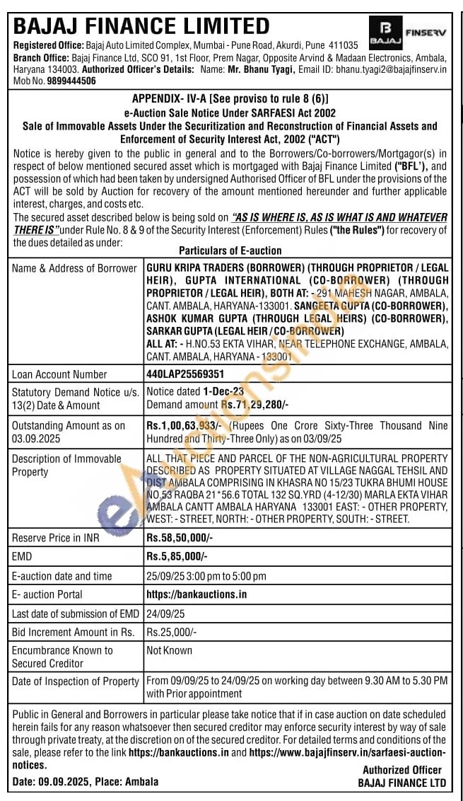 Contact Authorized Officer's Details: Name: Mr. Bhanu Tyagi, Email ID: bhanu.tyagi2@bajajfinserv.in Mob No. 9899444506
