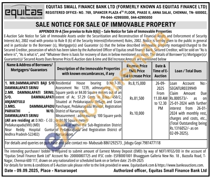 Residential House bearing D.No:7-39, Assessment No: 1239, admeasuring: 100 Square yards or 84.00 Square meters out of an extent of Ac. 57.29 Cents in D.No. 450/2, Situated at Pedakurapadu Vellage and Gram Panchayat, Pedakurapadu Mandal, Registration District of Narsaraopet. Measurement: admeasuring: 100 Square yards or 84.00 Square meters Situated at within the Sub-Registration District of Pedakurapadu and Registration District of Narsaraopet.