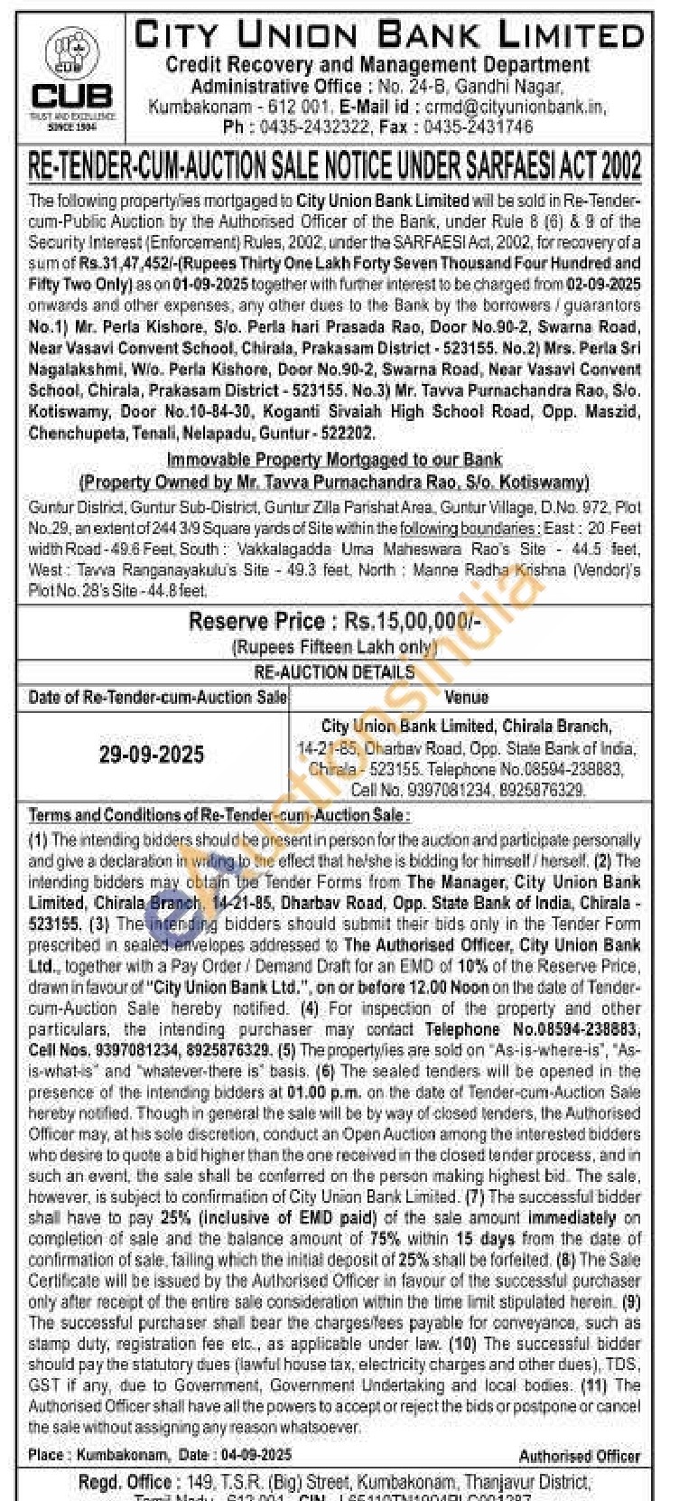 Guntur District, Guntur Sub-District, Guntur Zilla Parishat Area, Guntur Village, D.No. 972, Plot No. 29, an extent of 244 3/9 Square yards of Site within the following boundaries: East: 20 Feet width Road-49.6 Feet, South Vakkalagadda Uma Maheswara Rao's Site 44.5 feet, West: Tavva Ranganayakulu's Site-49.3 feet. North Manne Radha Krishna (Vendor)'s Plot No. 28's Site-44.8 feet