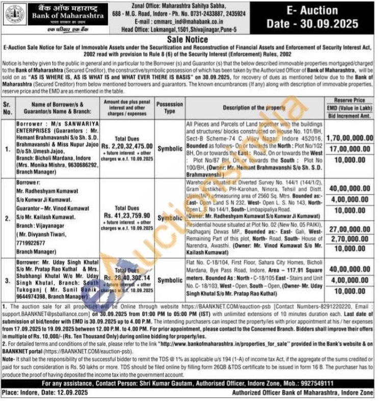 Contact Person: Shri Kumar Gautam, Authorised Officer, Indore Zone, Mob.: 9927549111