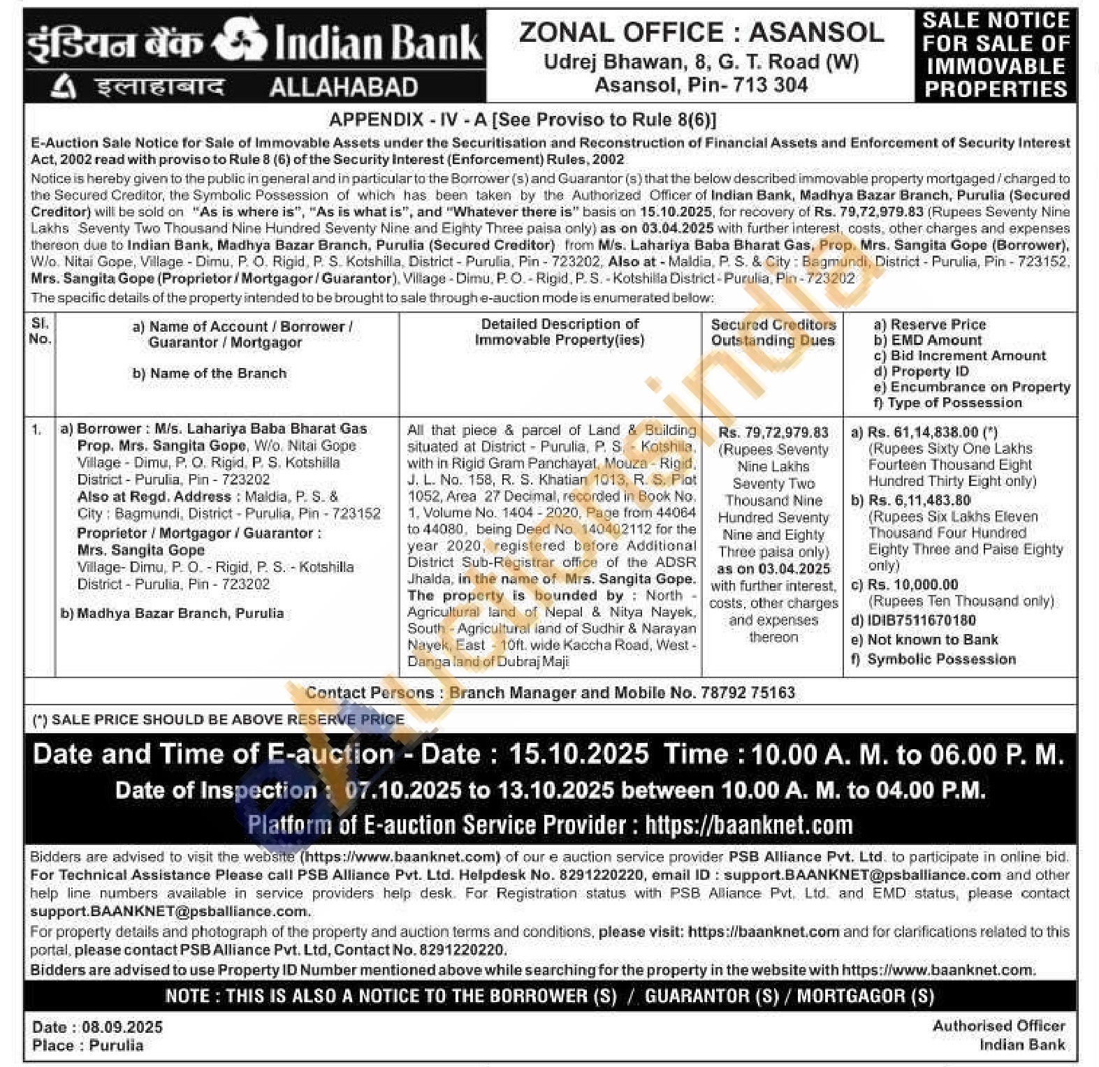All that piece & parcel of Land & Building situated at District Purulia, P. S. Kotshila, with in Rigid Gram Panchayat, Mouza - Rigid, J. L. No. 158, R. S. Khatian 1013, R. S. Piot 1052, Area 27 Decimal, recorded in Book No. 1. Volume No. 1404-2020, Page from 44064 to 44080, being Deed No. 140402112 for the year 2020, registered before Additional District Sub-Registrar office of the ADSR Jhalda, in the name of Mrs. Sangita Gope. The property is bounded by North Agricultural land of Nepal & Nitya Nayek, South-Agricultural land of Sudhir & Narayan Nayek, East-10ft. wide Kaccha Road, West-Danga land of Dubraj Maji