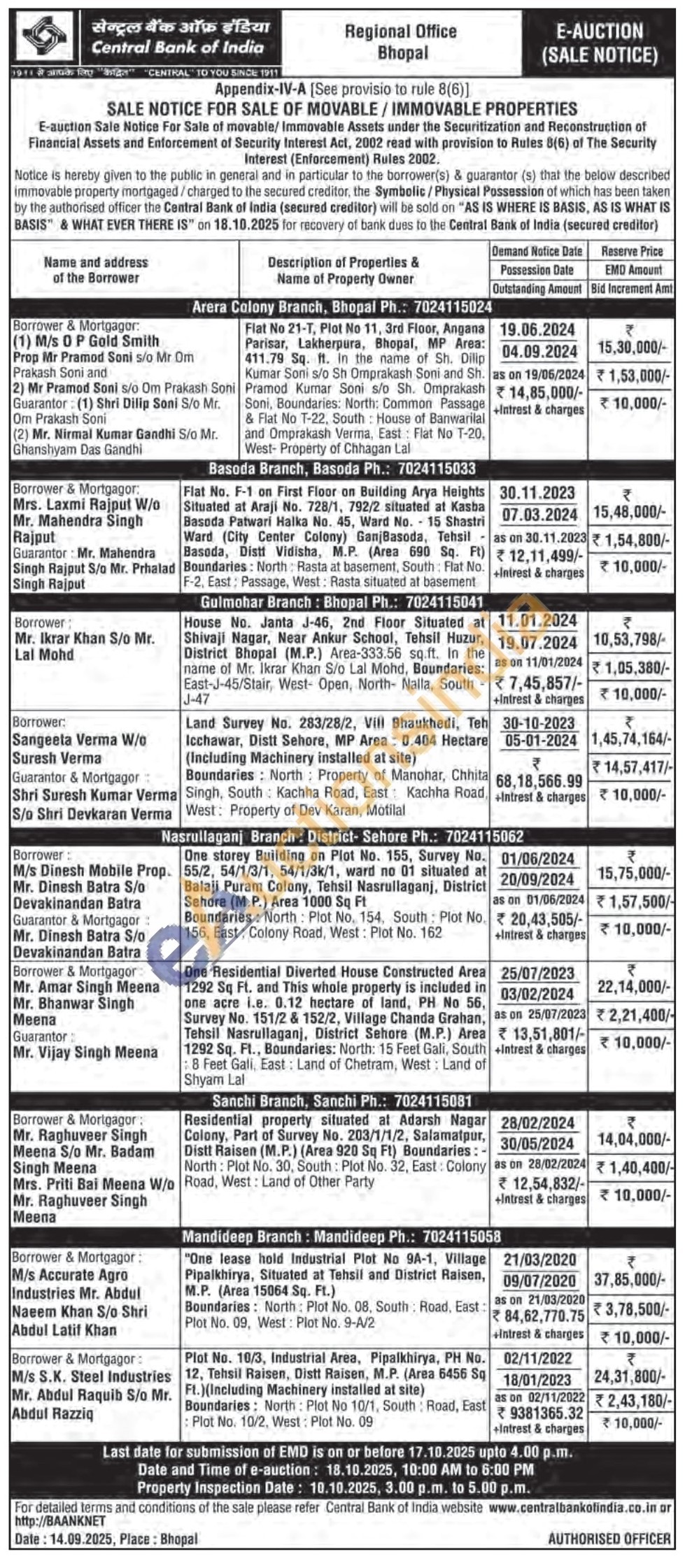 1) Flat No 21-T, Plot No 11, 3rd Floor, Angana Parisar, Lakherpura, Bhopal, MP Area: 411.79 Sq. ft. In the name of Sh. Dilip Kumar Soni s/o Sh Omprakash Soni and Sh. Pramod Kumar Soni s/o Sh. Omprakash Soni, Boundaries: North: Common Passage & Fiat No T-22, South House of Banwarilal and Omprakash Verma, East: Flat No T-20, West-Property of Chhagan Lal