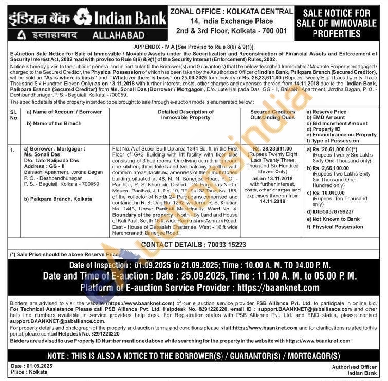Flat No. A of Super Built Up area 1344 Sq. ft. in the First Floor of G+3 Building with lift facility with floor tilles consisting of 3 bed rooms, One living cum dining room, one kitchen, three toilets and two balcony together with common areas, facilities, amenities of them multistoried building situated at 48, N. N. Banerjee Road, P. O. -Panihati, P. S. Khardah, District 24 Parganas North, Mouza-Panihati, J. L. No. 10, RE. Su. 32 Touzi No. 155, of the collector of North 24 Pargagans comprised and contained in R. S. Dag No. 1262, written in R. S. Khatian No. 1443, Under Panihati Municipality, Ward No. 4. Boundary of the property: North-By Land and House of Kali Paul, South 16 ft. wide Ramkrishna Ashram Road, East - House of Debasish Chatterjee, West-16 ft wide Narendranath Banerjee Road.