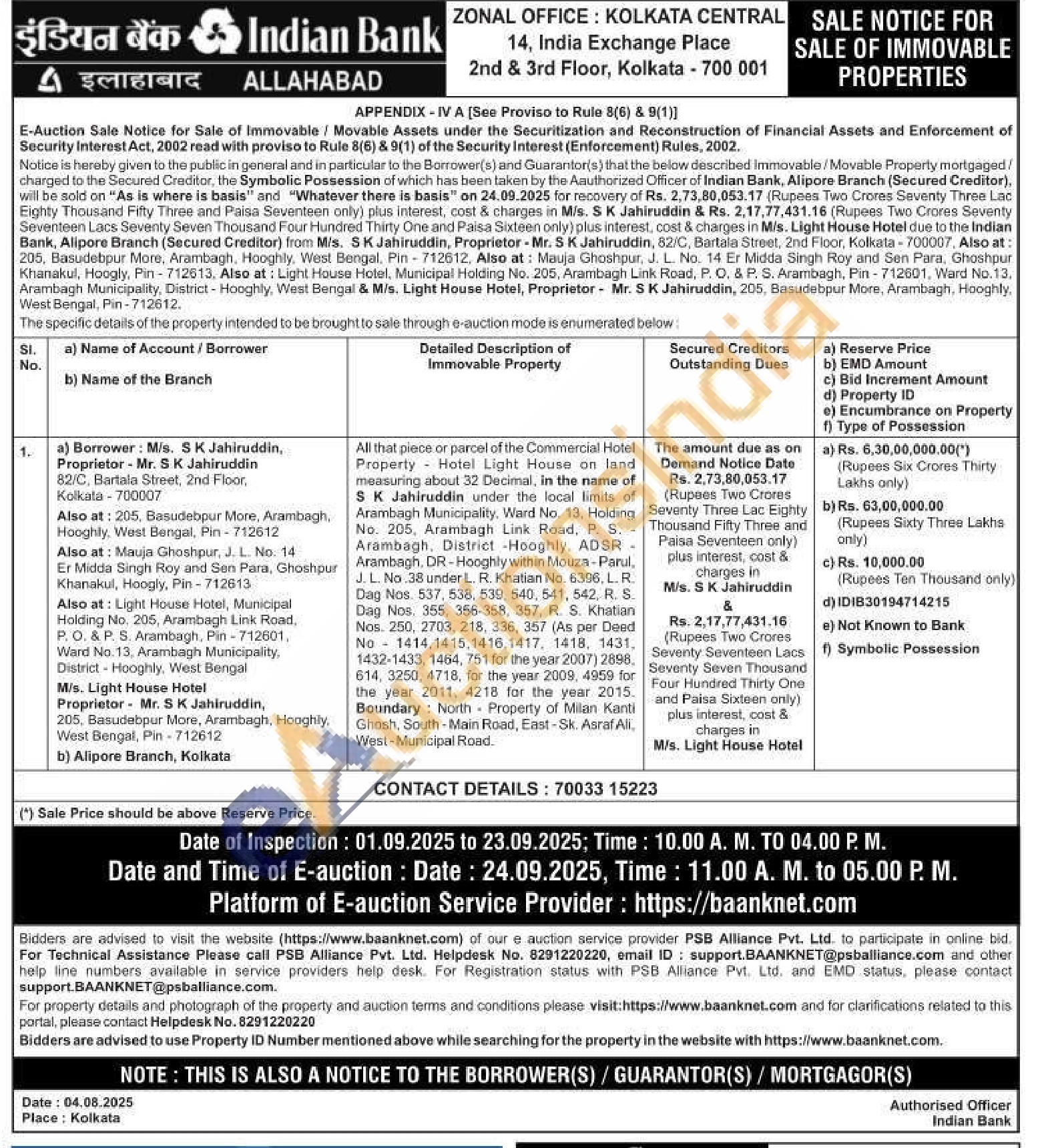 All that piece or parcel of the Commercial Hotel Property Hotel Light House on land measuring about 32 Decimal, in the name of SK Jahiruddin under the local limits of Arambagh Municipality, Ward No. 13, Holding No. 205, Arambagh Link Road, P. S. Arambagh, District -Hooghly, ADSR Arambagh, DR-Hooghly within Mouza - Parul. J. L. No.38 under L. R. Khatian No. 6396, L. R. Dag Nos. 537, 538, 539, 540, 541, 542, R. S. Dag Nos, 355, 356-358, 357, R. S. Khatian Nos. 250, 2703, 218, 336, 357 (As per Deed No 1414,1415,1416,1417, 1418, 1431, 1432-1433, 1464, 751 for the year 2007) 2898. 614, 3250, 4718, for the year 2009, 4959 for the year 2011, 4218 for the year 2015. Boundary: North Property of Milan Kanti Ghosh, South-Main Road, East-Sk. Asraf Ali. West-Municipal Road.