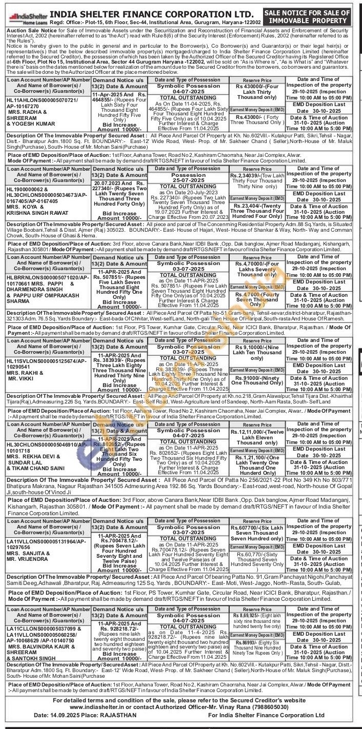 Description Of The Immovable Property/Secured Asset: All piece and parcel of The Concenming Residential Property Adm.88 Sq. Yards, is Situated Village Boobani, Tehsil & Disst. Ajmer (Raj) 305023. BOUNDARY:- East- House of Hajari, West- House of Shankar & Way, North-Way and Comman Chowk, South-House of Ghasi & Hema.