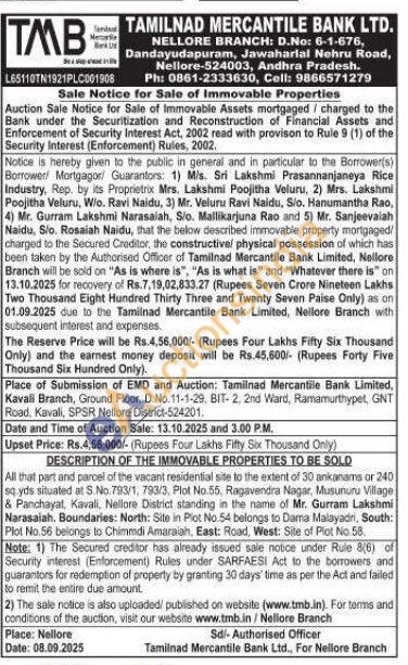 All that part and parcel of the vacant residential site to the extent of 30 ankanams or 240 sq yds situated at S.No. 793/1, 793/3, Plot No.55, Ragavendra Nagar, Musunuru Village & Panchayat, Kavali, Nellore District standing in the name of Mr. Gurram Lakshmi Narasaiah, Boundaries: North: Site in Plot No.54 belongs to Dama Malayadri, South: Plot No.56 belongs to Chimmdi Amaraiah, East: Road, West: Site of Plot No.58.
