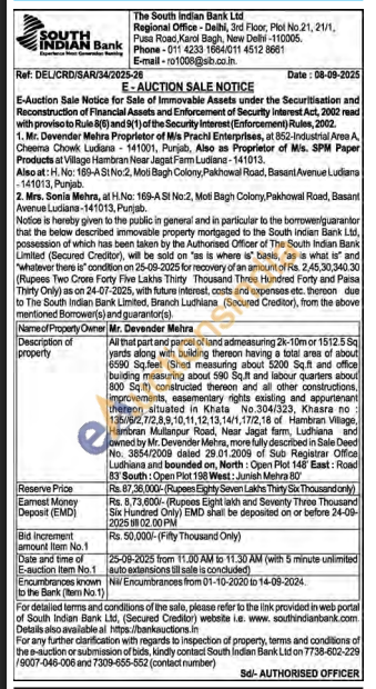 All that part and parcel of land admeasuring 2k-10m or 1512.5 Sq yards along with building thereon having a total area of about 6590 Sq.feet (Shed measuring about 5200 Sq.ft and office buliding measuring about 590 Sq.ft and labour quarters about 800 Sq.ft) constructed thereon and all other constructions, improvements, easementary rights existing and appurtenant thereon situated in Khata No.304/323, Khasra no 135/6/2,7/2,8,9,10,11,12,13,14/1,17/2,18 of Hambran Village, Hambran Multanpur Road, Near Jagat farm, Ludhiana and owned by Mr. Devender Mehra, more fully described in Sale Deed No. 3854/2009 daled 29.01.2009 of Sut Registrar Office Ludhiana and bounded on, North: Open Plot 148' East: Road 83 South: Open Plot 198 West: Junish Mehra 80