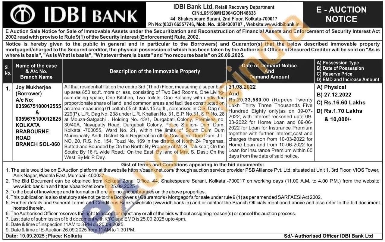 All that residential flat on the entire 3rd (Third) Floor, measuring a super built up area 850 sq.ft. more or less, consisting of Two Bed Rooms, One Living- cum-dining space, One Kitchen, Two Toilets, One Balcony with undivided proportionate share of land, and common areas and facilities constructed on an area measuring 01 cottah 05 chittaks 15 sq.ft., comprised in C.S. Dag no. 229(P), L.R. Dag No. 238 under L.R. Khatian No. 31, E.P. No.31, S.P. No. 28 at Mouza-Satgachi Holding No. 43/1, Durgabati Colony, Premises no. 30/40A, Nayapatty Road, Durgabati Colony, Police Station- Dum Dum, Kolkata -700055, Ward No. 21, within the limits of South Dum Dum Municipality, Addl. District Sub-Registration office Cossipore Dum Dum, J.L. NO. 20, R.S. No. 154, Touzi No. 169 in the district of North 24 Parganas, Butted and Bounded by: On the North: By Property of Mr. S. Talukdar, On the South: By 16 ft. wide Road,; On the East: By land of Mrs. S. Das.; On the West: By Mr. P. Dey