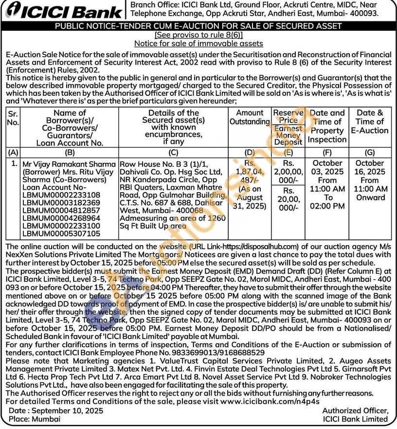 Row House No. B 3 (1)/1, Dahivali Co. Op. Hsg Soc Ltd, NR Kanderpada Circle, Opp RBI Quaters, Laxman Mhatre Road, Opp Gulmohar Building. C.T.S. No. 687 & 688, Dahisar West, Mumbai- 400068 Admeasuring an area of 1260 Sq Ft Built Up area