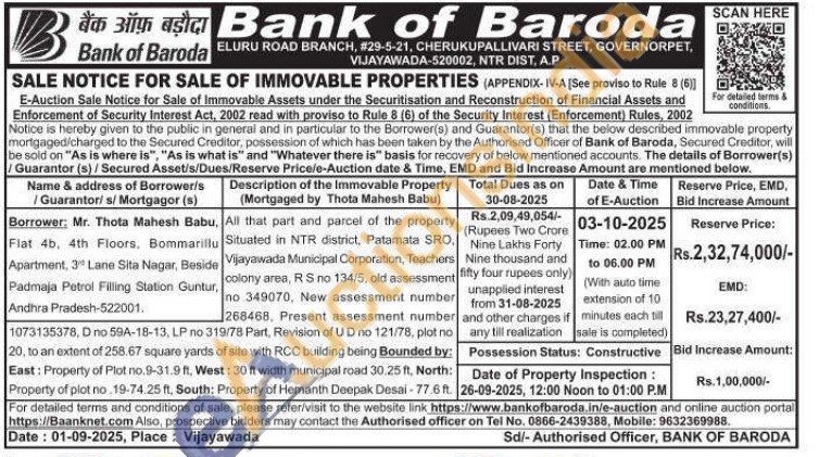 All that part and parcel of the property Situated in NTR district, Patamata SRO. Vijayawada Municipal Corporation, Teachers colony area, R S no 134/5, old assessment no 349070, New assessment number 268468, Present assessment number 1073135378, D по 59A-18-13, LP no 319/78 Part, Revision of UD no 121/78, plot no 20, to an extent of 258.67 square yards of site with RCC building being Bounded by: East: Property of Plot no.9-31.9 ft, West: 30 ft width municipal road 30.25 ft, North: Property of plot no 19-74.25 ft, South: Property of Hemanth Deepak Desai-77.6 ft