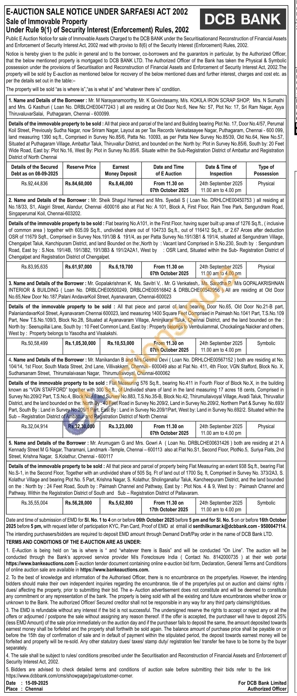 4) Flat Measuring 576 Sq.ft., bearing No.411 in Fourth Floor of Block No.X, in the building known as "VGN STAFFORD" together with 300 Sq.ft., of Undivided share of land in the land measuring 17 acres 18 cents, Comprised in Survey No.209/2 Part, T.S.No.4, Block No.46 and Survey No.883, T.S.No.35-B, Block No.42, Thirumullaivoyal Village, Avadi Taluk, Thiruvallur District, and the land bounded on the: North By: 40 Feet Road in Survey No.209/2, Land in Survey No.209/2, Northern Part & Survey No.693/Part, South By: Land in Survey No.209/1 Part, East By: Land in Survey No.209/1Part, West by: Land in Survey No.692/2. Situated within the Sub-Registration District of Ambattur and Registration District of North Chennai