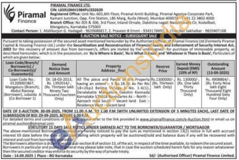 All The piece and Parcel of the Property having an extent 5 No.18-2b As Per Rtc 18 = 2bp * 2 Belma Village D No. 1-6(1), Mangalore Dakshin Kannada Karnataka-575018 Boundaries As-North: Aproach road South Vacant land East-Residence West: Vacant land