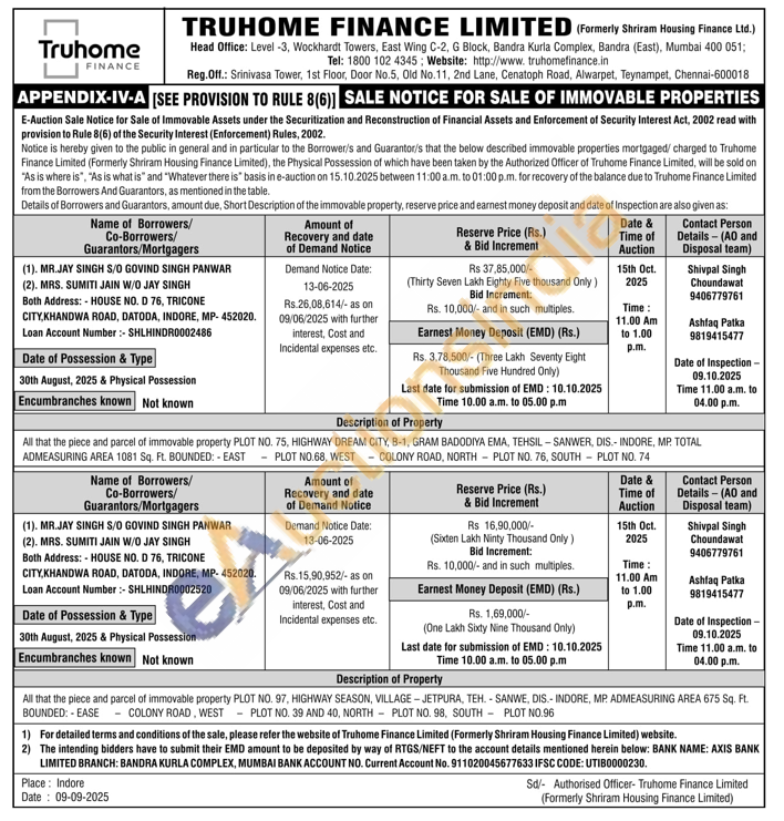 All that the piece and parcel of immovable property PLOT NO. 97, HIGHWAY SEASON, VILLAGE-JETPURA, TEH-SANWE, DIS.- INDORE, MP ADMEASURING AREA 675 Sq. Ft. BOUNDED:EASE COLONY ROAD, WEST - PLOT NO. 39 AND 40, NORTH PLOT NO. 98, SOUTH PLOT NO.96