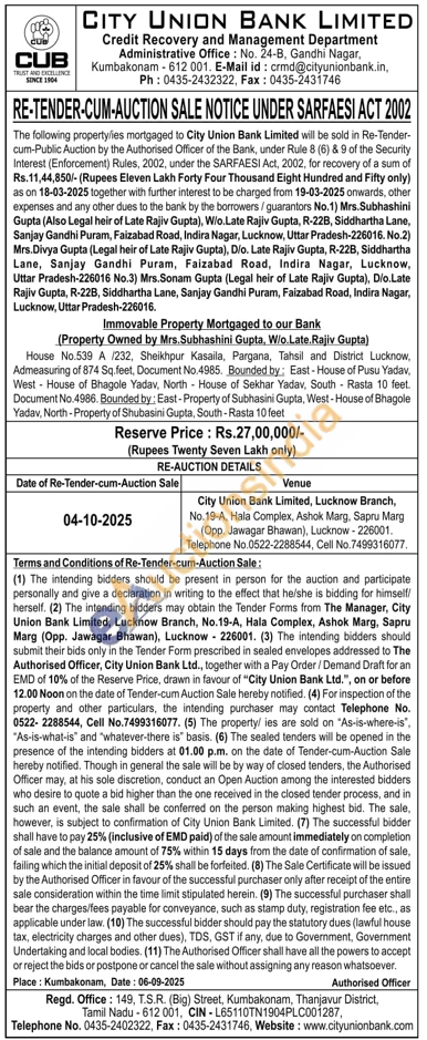 House No.539 A /232, Sheikhpur Kasaila, Pargana, Tahsil and District Lucknow, Admeasuring of 874 Sq.feet, Document No. 4985. Bounded by: East-House of Pusu Yadav, West House of Bhagole Yadav, North House of Sekhar Yadav, South Rasta 10 feet. Document No.4986. Bounded by: East-Property of Subhasini Gupta, West-House of Bhagole Yadav, North-Property of Shubasini Gupta, South-Rasta 10 feet