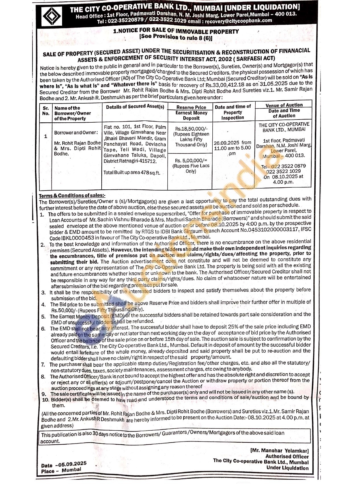 Flat no. 101, 1st Floor, Palm Ville, Village Gimvahane Near Bhairi Bhavani Mandir, Gram Panchayat Road, Devlacha Tape, Tell Wadi, Village Gimvahane Taluka, Dapoli, District Ratnagiri-415712. Total Built up area 478 sq.ft