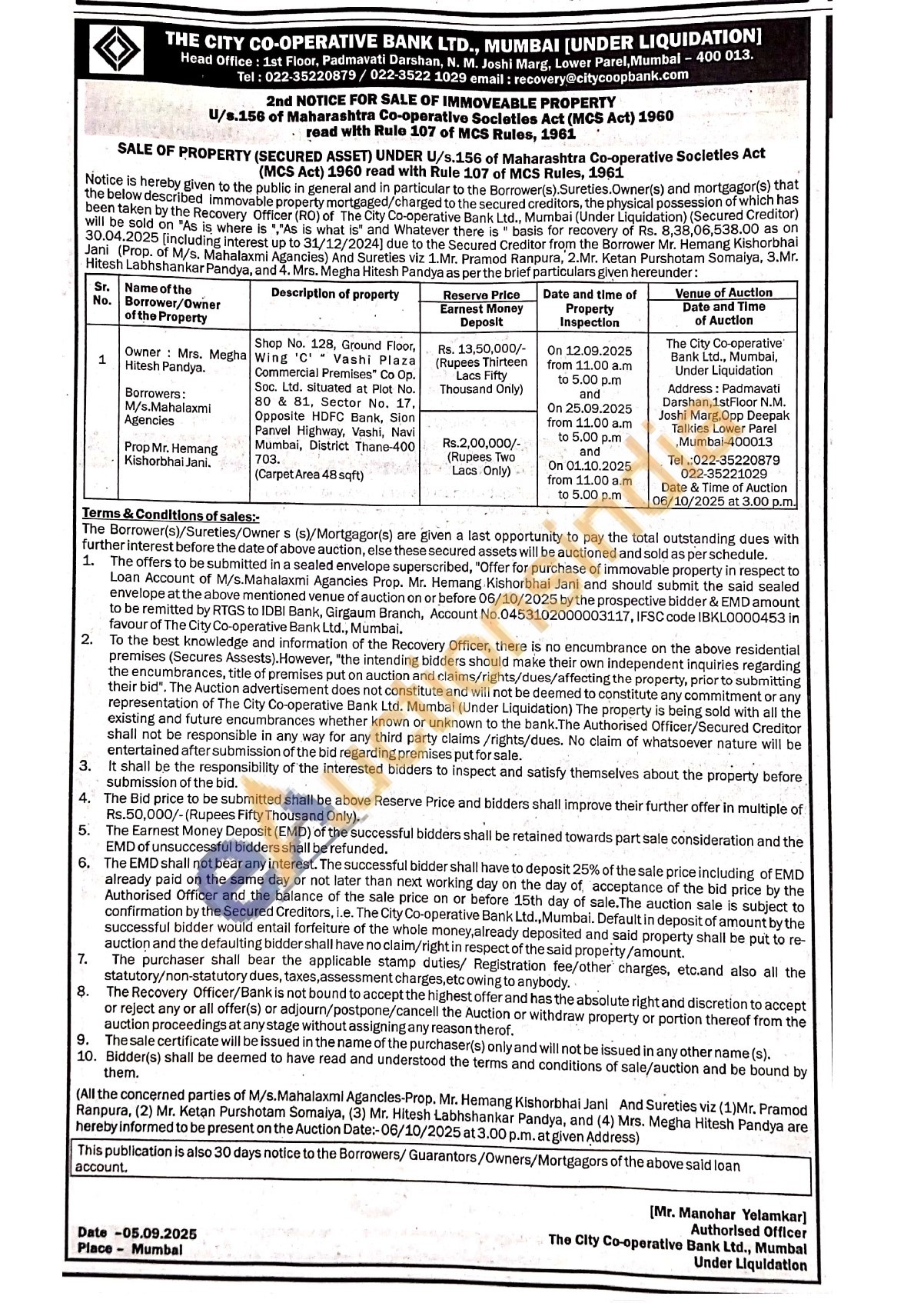 Shop No. 128, Ground Floor, Wing 'C' Vashi Plaza Commercial Premises" Co Op. Soc. Ltd. situated at Plot No. 80 & 81, Sector No. 17, Opposite HDFC Bank, Sion Panvel Highway, Vashi, Navi Mumbai, District Thane-400 703. (Carpet Area 48 sqft