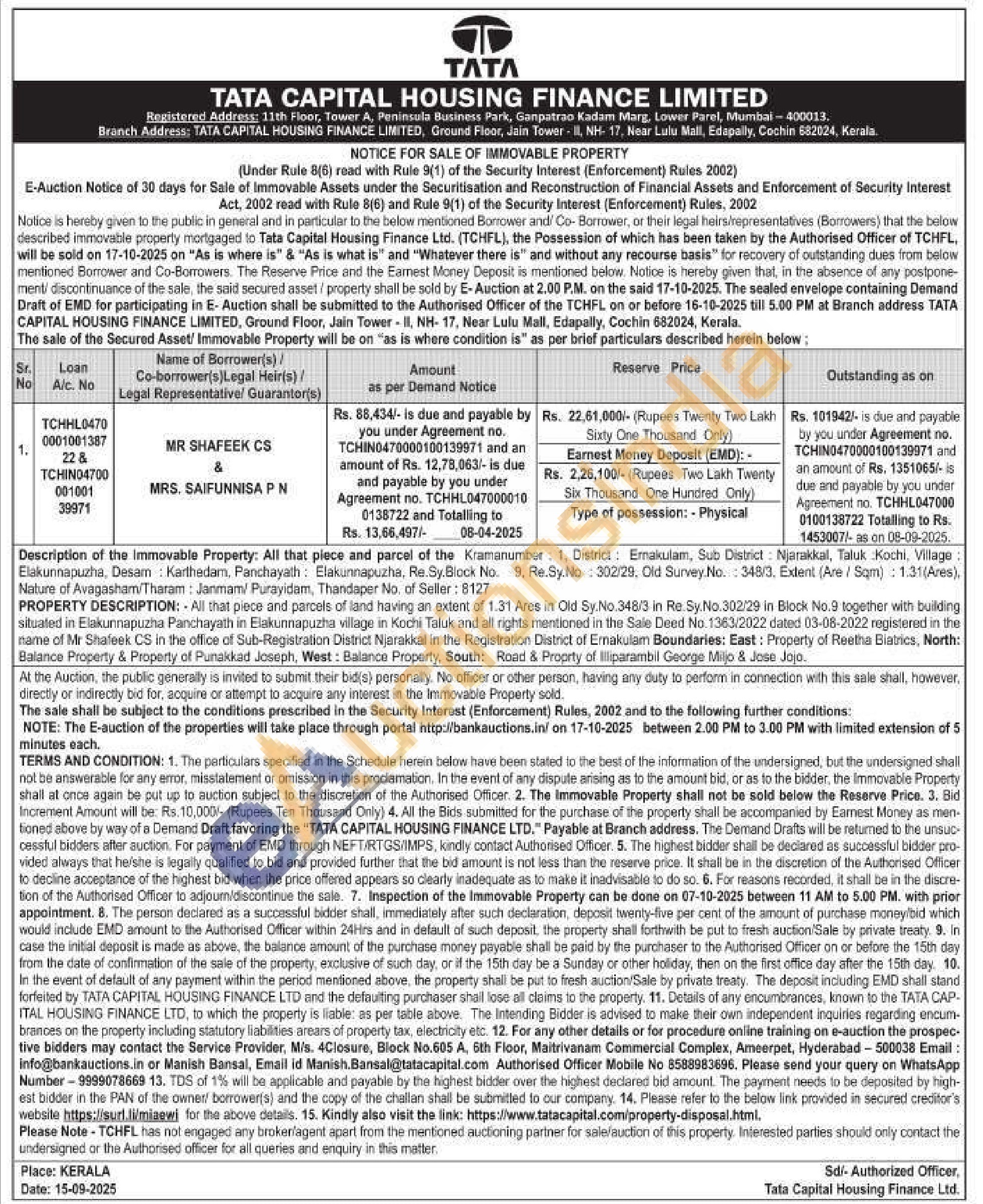All that piece and parcel of the Kramanumber 1, District: Ernakulam, Sub District: Njarakkal, Taluk Kochi, Village: Elakunnapuzha, Desam: Karthedam, Panchayath: Elakunnapuzha, Re.Sy.Block No. 9. Re.Sy No: 302/29. Old Survey.No.: 348/3. Extent (Are/Sqm): 1.31(Ares), Nature of Avagasham/Tharam: Janmam/ Purayidam, Thandaper No. of Seller: 8127 PROPERTY DESCRIPTION: All that piece and parcels of land having an extent of 1.31 Ares in Old Sy.No.348/3 in Re.Sy.No.302/29 in Block No.9 together with building situated in Elakunnapuzha Panchayath in Elakunnapuzha village in Kochi Taluk and all rights mentioned in the Sale Deed No. 1363/2022 dated 03-08-2022 registered in the name of Mr Shafeek CS in the office of Sub-Registration District Njarakkal in the Registration District of Ernakulam Boundaries: East: Property of Reethe Biatrics, North: Balance Property & Property of Punakkad Joseph, West: Balance Property, South: Road & Proprty of liparambil George Miljo & Jose Jajo.