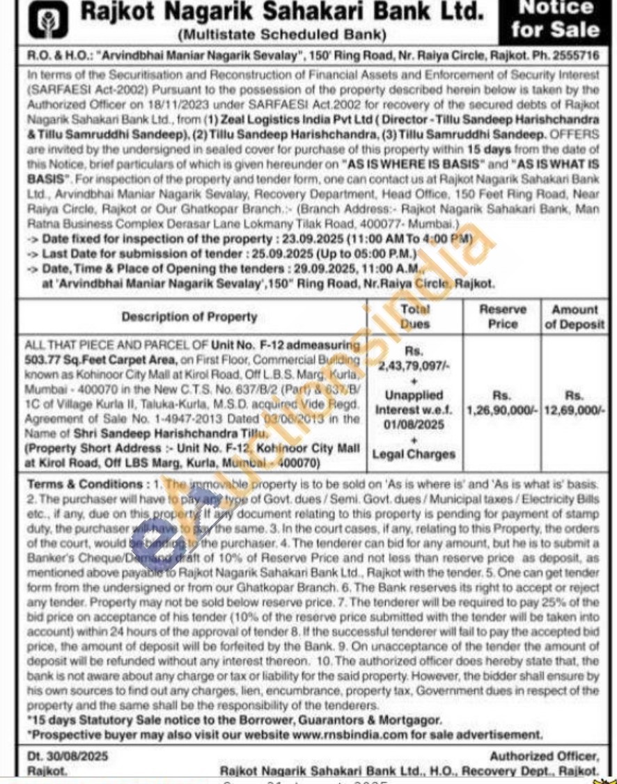 ALL THAT PIECE AND PARCEL OF Unit No. F-12 admeasuring 503.77 Sq.Feet Carpet Area, on First Floor, Commercial Building known as Kohinoor City Mall at Kirol Road, Off L.B.S. Marg, Kurla, Mumbai-400070 in the New C.T.S. No. 637/B/2 (Part) & 637/B/1C of Village Kurla II, Taluka-Kurla, M.S.D. acquired Vide Regd. Agreement of Sale No. 1-4947-2013 Dated 03/06/2013 in the Name of Shri Sandeep Harishchandra Tillu