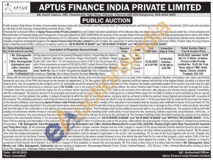 All that piece and parcel of the property Prakasam District, Ongole Reg-Div, Martoor Sub-Div, Martoor Mandalam, Jonnathali Village Panchayetti, Jonnathali Vilage Sy No. 126/1, Door No. 1-113, Ad measuring an extent of 88.14 Sq Yds of house site within these boundaries an extent of 336 Sq Ft of RCC rooled Ground Floor Balding attached with all easement rights appuntenant thereto being bounded by:- Bound-aries: North By: Site of Chavali Singarakonda South By: Site of Kakaraperthi Ra manjaneyulu East By: Ste of Narne Anantha Ramaiah West By: Bazar