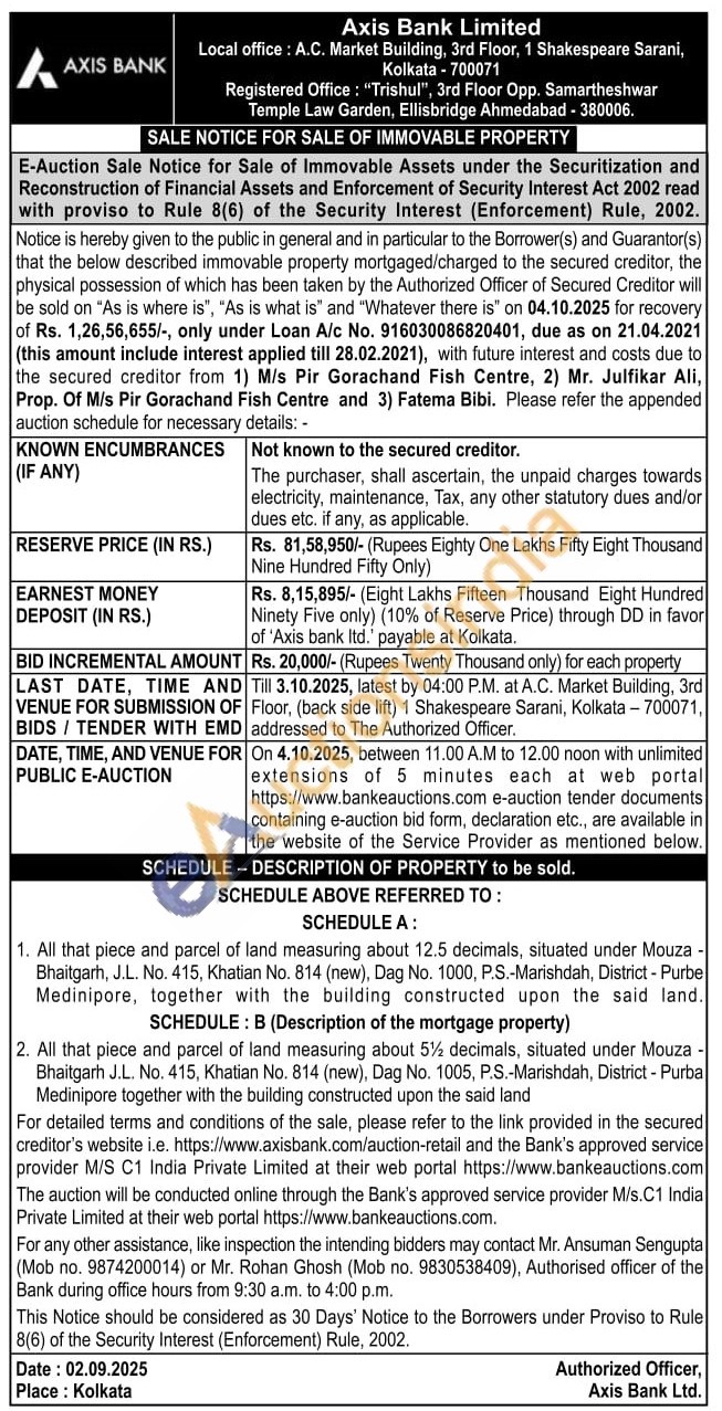 All that piece and parcel of land measuring about 12.5 decimals, situated under Mouza -Bhaitgarh, J.L. No. 415, Khatian No. 814 (new), Dag No. 1000, P.S.-Marishdah, District - Purbe Medinipore, together with the building constructed upon the said land