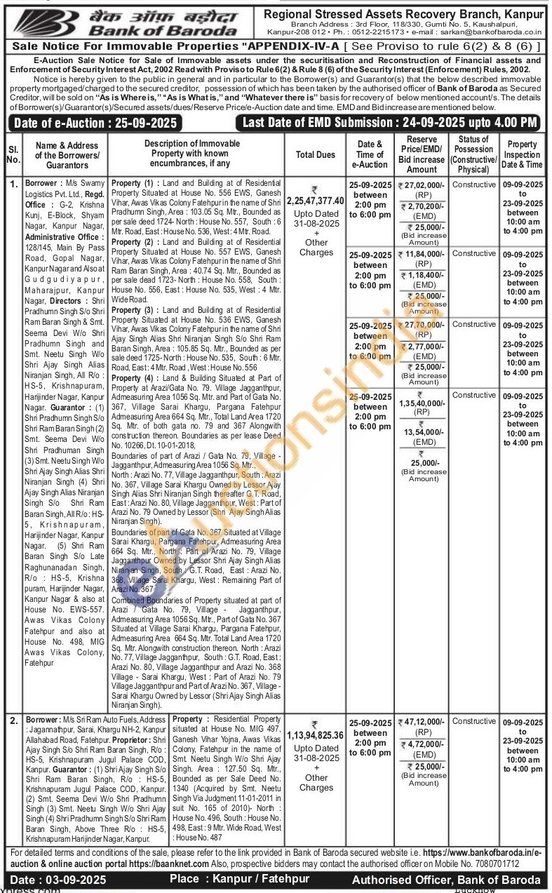 Property (4): Land & Building Situated at Part of Property at Arazi/Guata No. 79. Village Jagganthpur, Admeasuring Area 1056 Sq. Mtr. and Part of Gata No. 367, Village Sarai Khargu, Pargana Fatehpur Admeasuring Area 664 Sq. Mtr., Total Land Area 1720 Sq Mtr. of both gata no. 79 and 367 Alongwith construction thereon. Boundaries as per lease Deed No. 10266, Dt. 10-01-2018, Boundaries of part of Arazi/Gata No. 79, Village Jagganthpur, Admeasuring Area 1056 Sq Mir. North: Arazi No. 77, Village Jagganthpur, South: Arazi No, 367, Village Sarai Khargu Owned by Lessor Ajay Singh Alias Shri Niranjan Singh thereafter G.T. Road, East: Arazi No. 80, Village Jagganthpur, West: Part of Arazi No. 79 Owned by Lessor (Shri Ajay Singh Alias Niranjan Singh). Boundaries of part of Gata No. 367 Situated at Village Sarai Khargu, Pargana Fatehpur, Admeasuring Area 664 Sq. Mir, North Part of Arazi No. 79, Village Jagganthour Owned by Lessor Shri Ajay Singh Allas Niranjan Singh, South G.T. Road, East: Arazi No. 368, Village Sarai Khargu, West: Remaining Part of Arazi No. 367