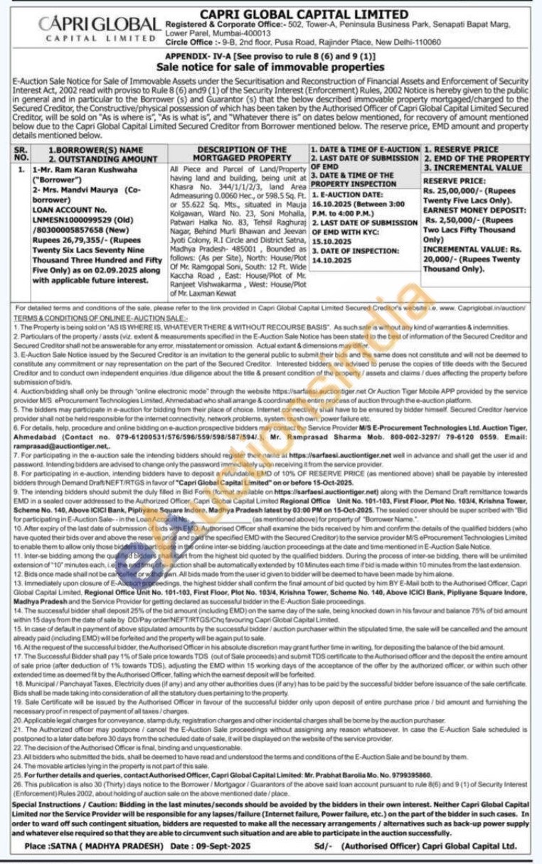 All Plece and Parcel of Land/Property having land and building, being unit at Khasra No. 344/1/1/2/3, land Area Admeasuring 0.0060 Hec, or 598.5 Sq. Ft. or 55.622 Sq. Mts, situated in Mauja Kolgawan, Ward No. 23, Soni Mohalla, Patwari Halka No. 83, Tehsil Raghuraj Nagar, Behind Murli Bhawan and Jeevan Jyoti Colony, R.1 Circle and District Satna, Madhya Pradesh- 485001, Bounded as follows: (As per Site), North: House/Plot Of Mr. Ramgopal Soni, South: 12 Pt. Wide Kaccha Road, East: House/Pict of Mc Ranjeet Vishwakarma, West: House/Plot of Mr. Laxman Kewat